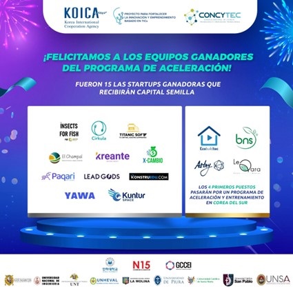 Del 19 de mayo al 30 de septiembre, se realizó el concurso KOICA Perú Startup League 2022 que tiene como objetivo desarrollar un programa de aceleración y descubrir a startups con tecnologías avanzadas y productos prometedores en el ámbito de TICS y apoyar su comercialización.